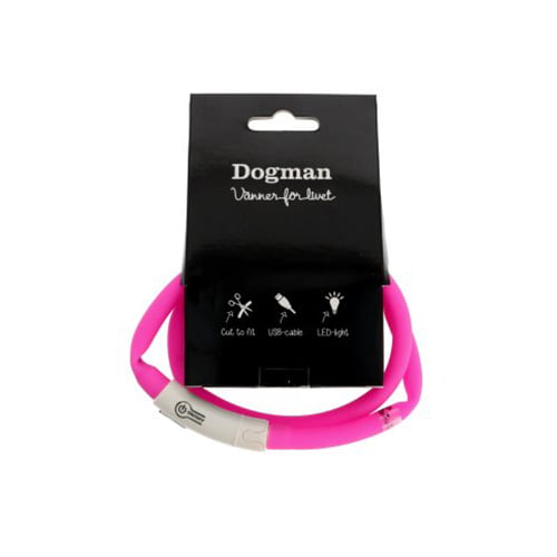 Lysende halsbånd i silikon som lades med USB. Velg mellom 2 forskjellige blinkehastigheter eller konstant lys. Halbåndet klippes til riktig størrelse.
