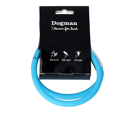 Lysende halsbånd i silikon som lades med USB. Velg mellom 2 forskjellige blinkehastigheter eller konstant lys. Halbåndet klippes til riktig størrelse.