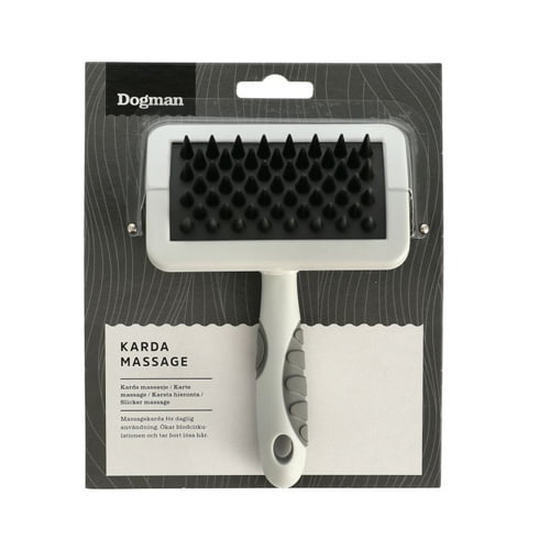 Massasjekarde av gummi fra Dogman. Øker blodsirkulasjonen og fjerner løse hår. Er så skånsom at den kan brukes daglig. Til kort pels.