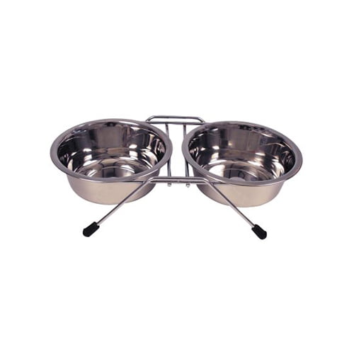 Praktisk og klassisk sett med 2 hundeskåler i stativ. Laget av rustfritt stål, kan vaskes i oppvaskmaskin. Gummi rundt bena på stativet for å gjøre det stabilt.
