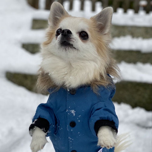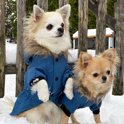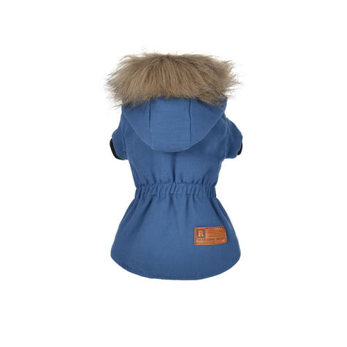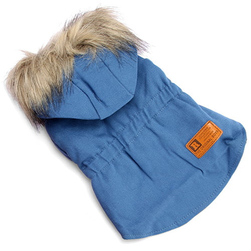 Hold hunden varm med en stilig, fôret parkas laget av denimlignende stoff med fuskepels på hetten.
