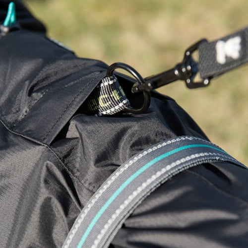 Halskragen kan justeres både oppe og nede for beste passform. For å beskytte hele lårmuskelen har dekkenet ekstra langt bakparti som dessuten er justerbart for å passe alle raser uansett haleføring. Teppet er også utstyrt med vanlig borrelåsbånd til å feste rundt bakbeina. Kobbelåpning for både halsbånd og sele.